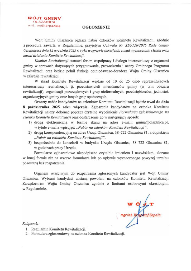 Ogłoszenie Wójta Gminy Olszanica w sprawie naboru członków Komitetu Rewitalizacji. 23 września 2025 Regulamin Komitetu Rewitalizacji Formularz zgłoszeniowy na członka Komitetu Rewitalizacji Nawigacja wpisu Poprzedni Poprzedni wpis: NARODOWE CZYTANIE W GMINNEJ BIBLIOTECE PUBLICZNEKJ W OLSZANICY !Następny Następny wpis: Informacja o sesji Rady Gminy Olszanica w dniu 30 września 2025 r. (wtorek) o godz. 15:00