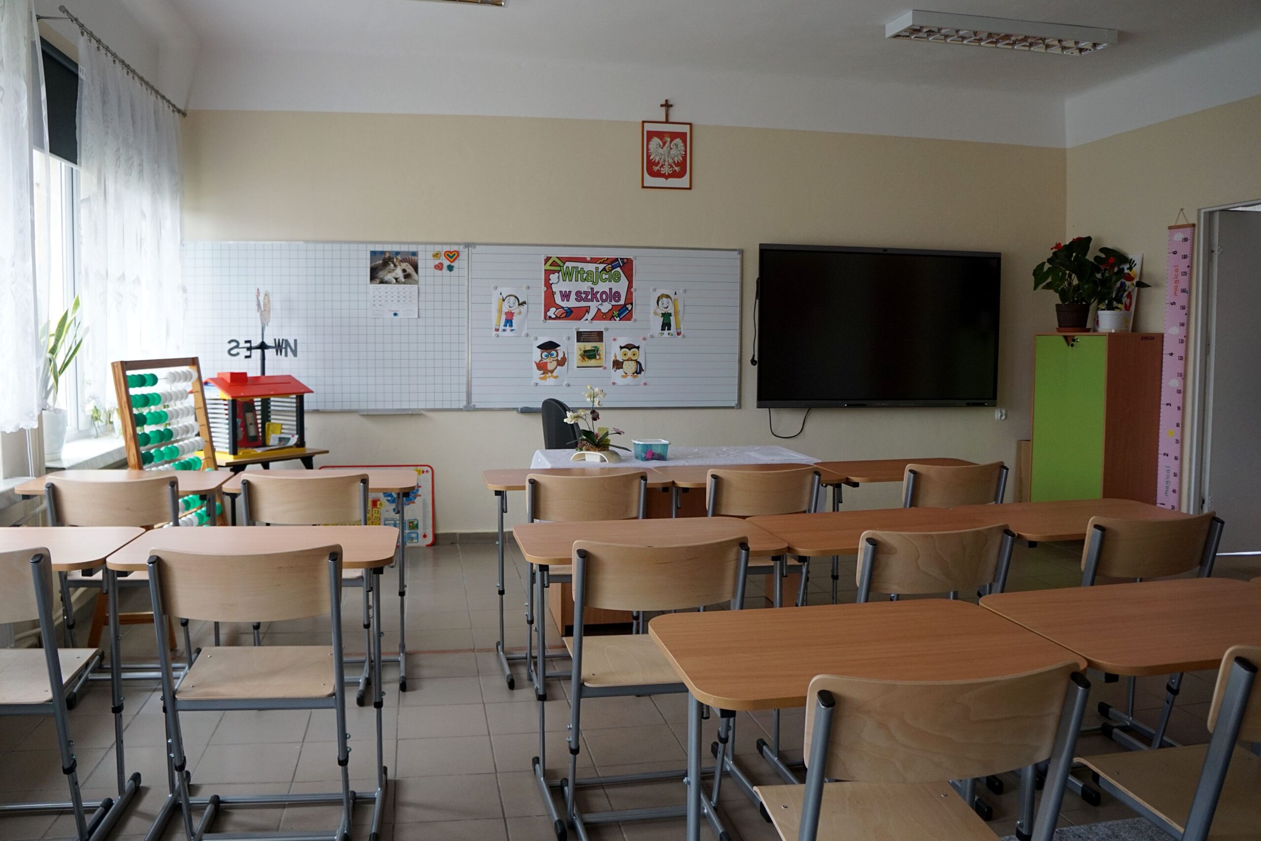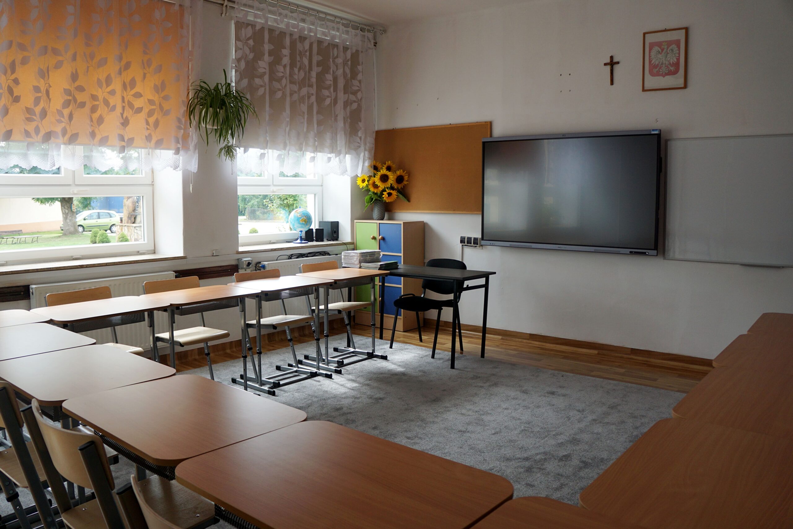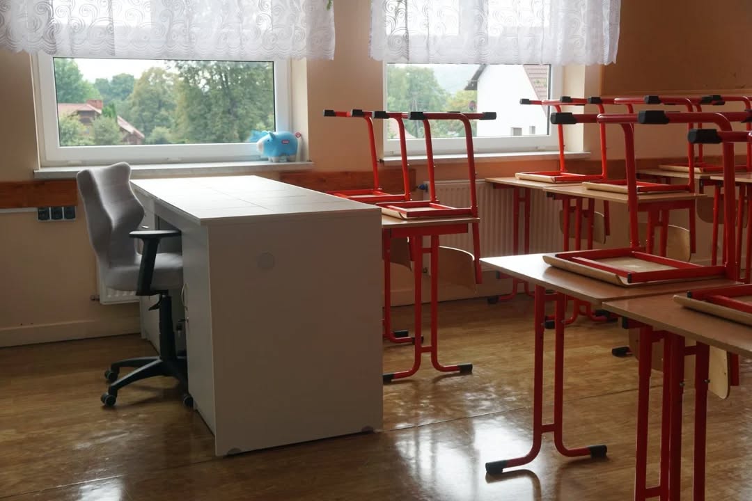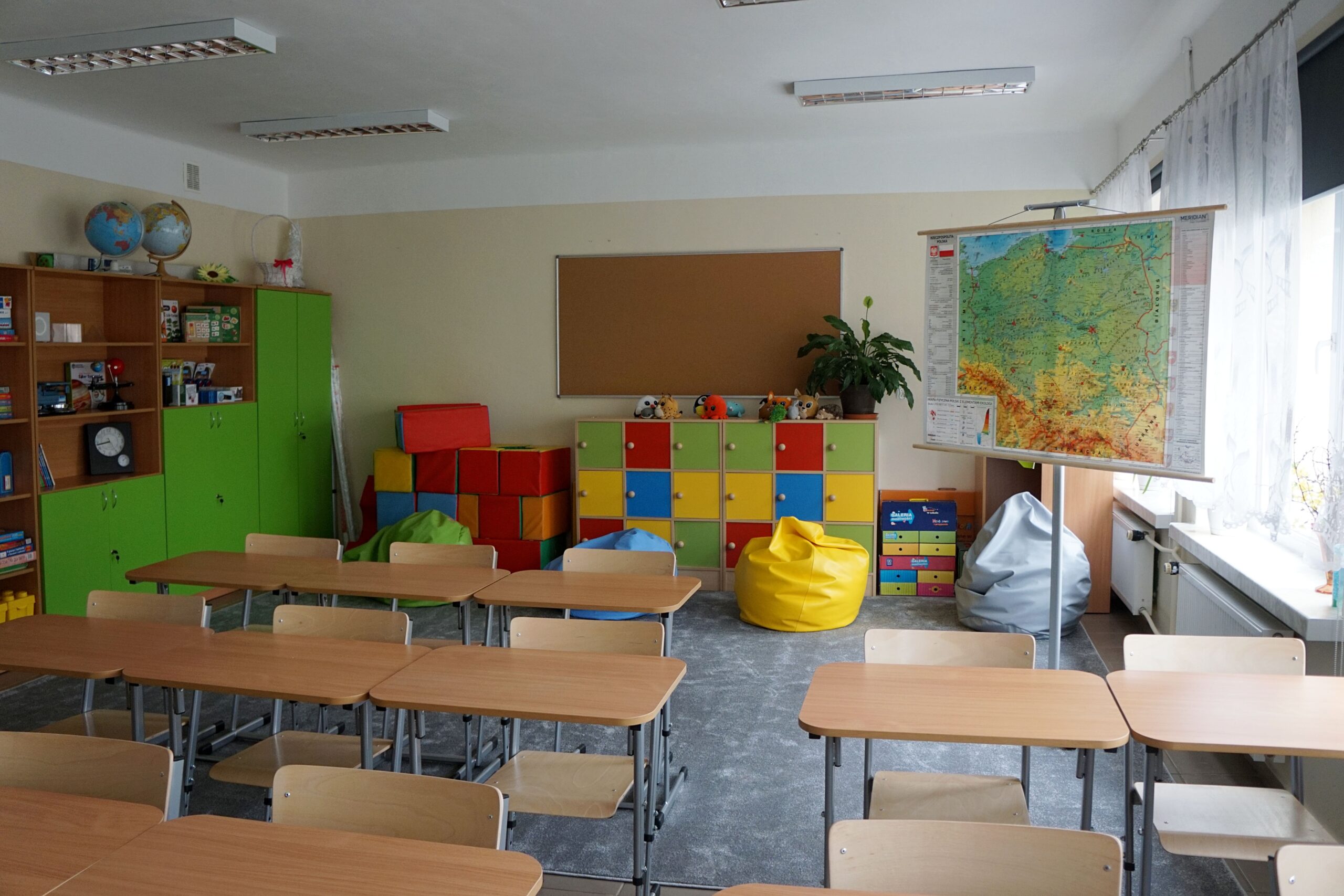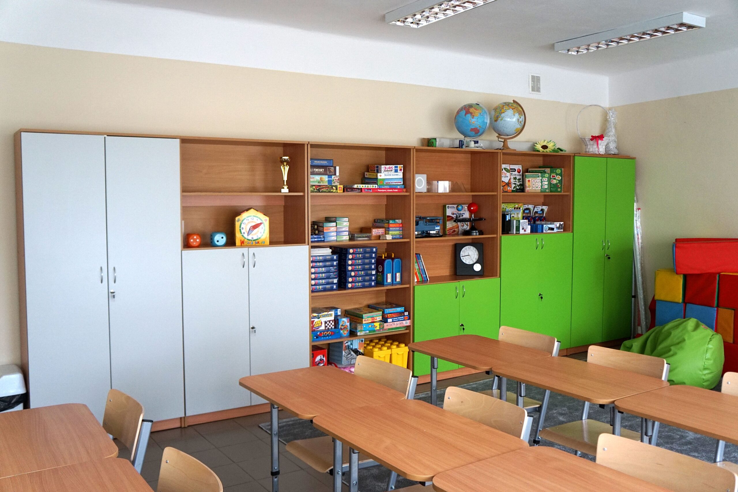 – meble (stoliki terminalowe, krzesła uczniowskie, biurko i fotel dla nauczyciela/ nauczycielki, szafy do przechowywania pomocy)