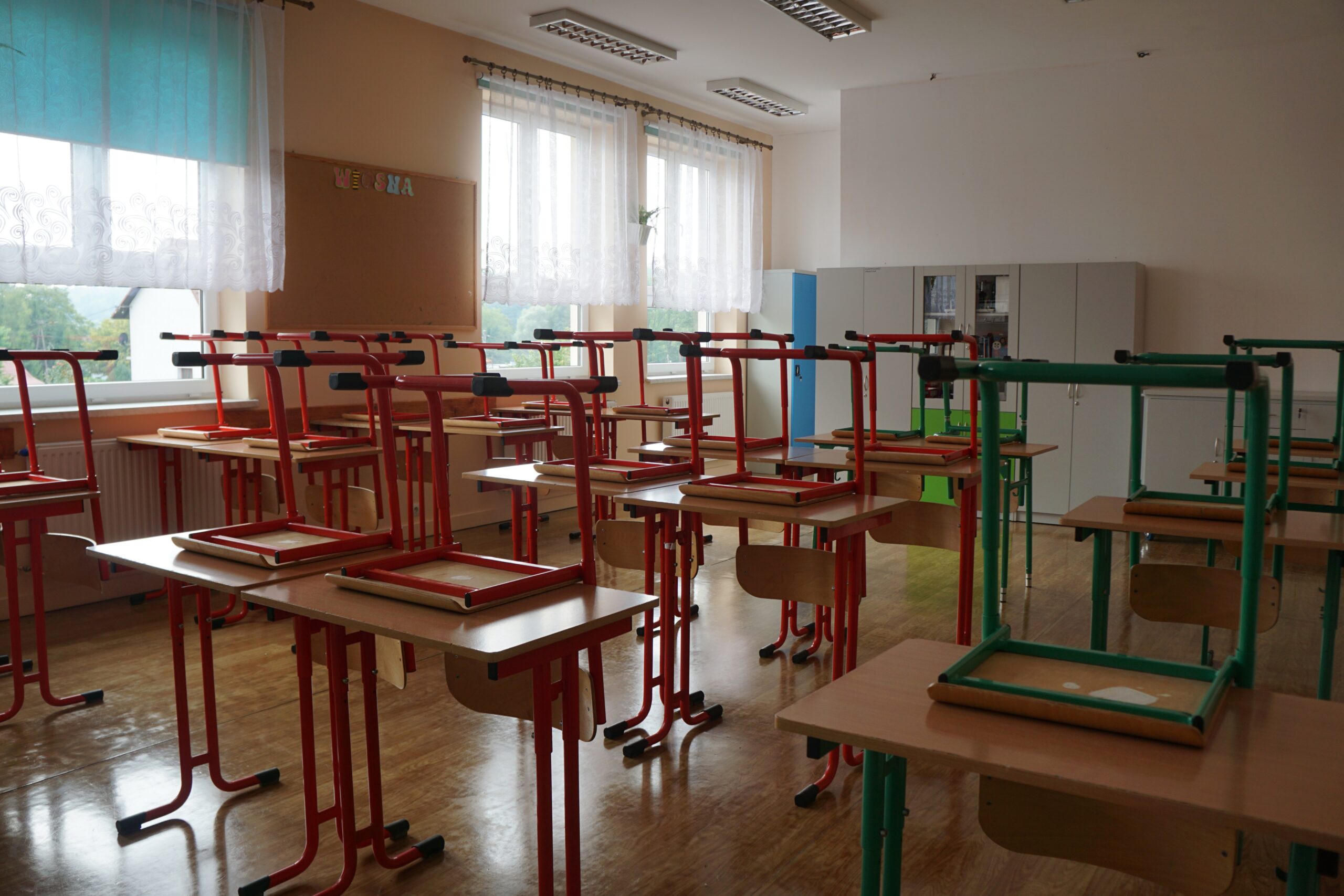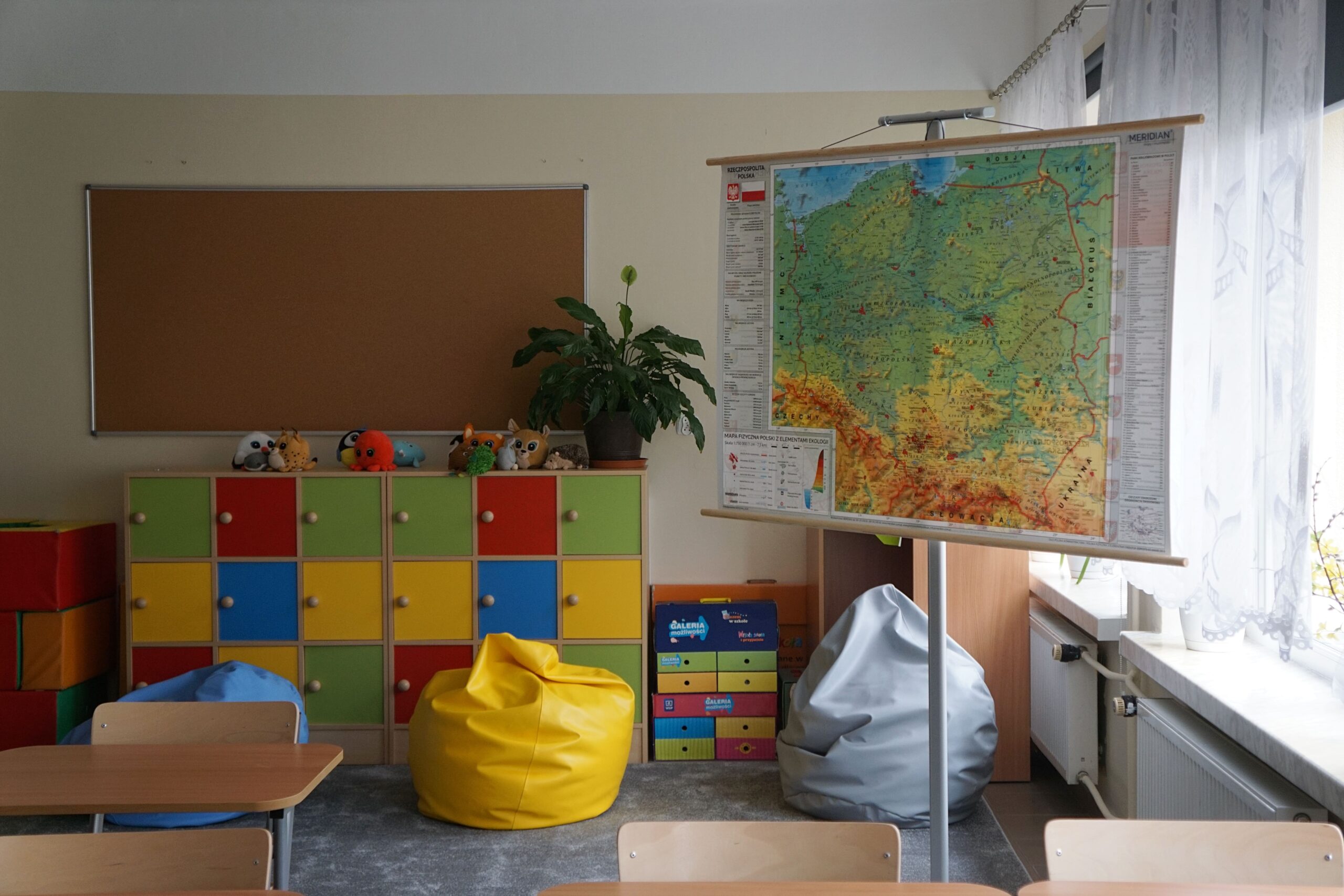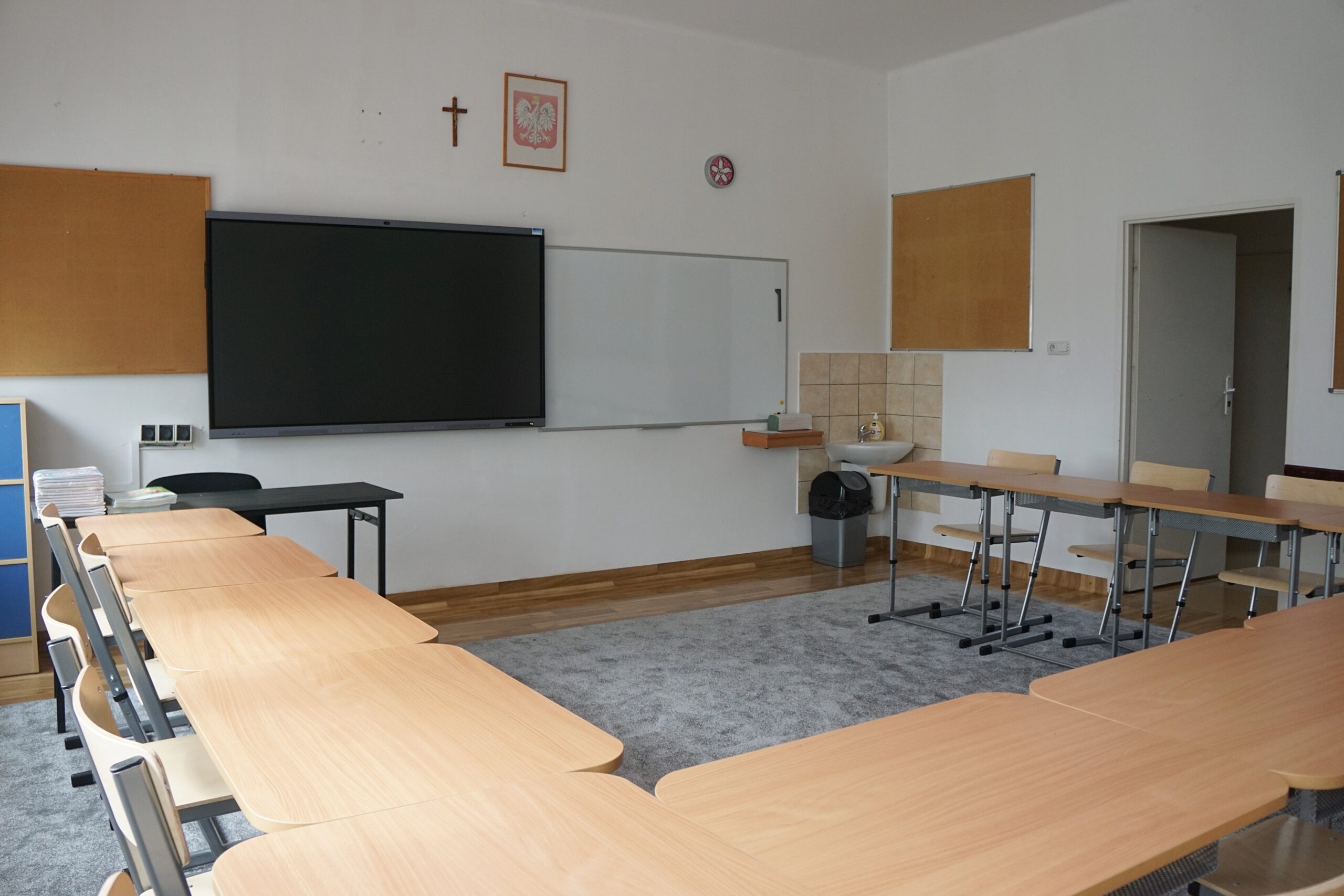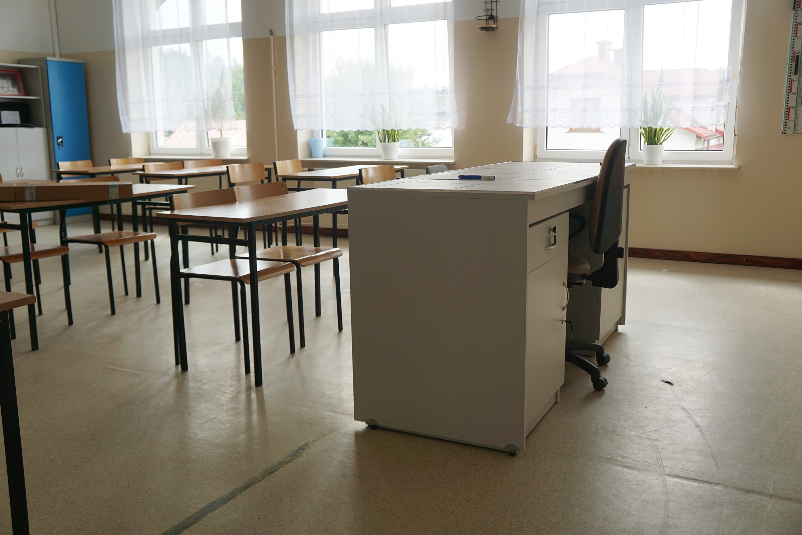 – meble (stoliki terminalowe, krzesła uczniowskie, biurko i fotel dla nauczyciela/ nauczycielki, szafy do przechowywania pomocy)