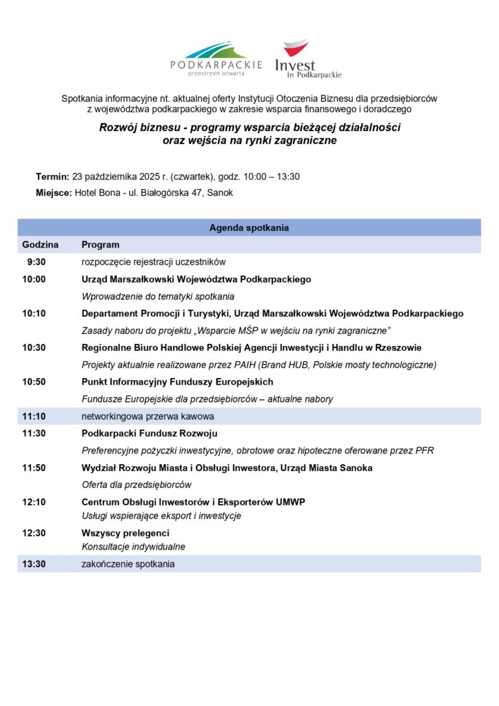 Centrum Obsługi Inwestorów i Eksporterów, działające w strukturach Urzędu Marszałkowskiego Województwa Podkarpackiego w Rzeszowie, serdecznie zaprasza przedsiębiorców z województwa podkarpackiego na spotkanie informacyjne pn. „ROZWÓJ BIZNESU – PROGRAMY WSPARCIA BIEŻĄCEJ DZIAŁALNOŚCI ORAZ WEJŚCIA NA RYNKI ZAGRANICZNE”.